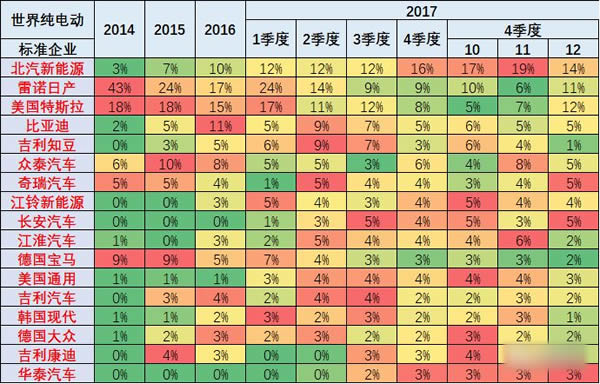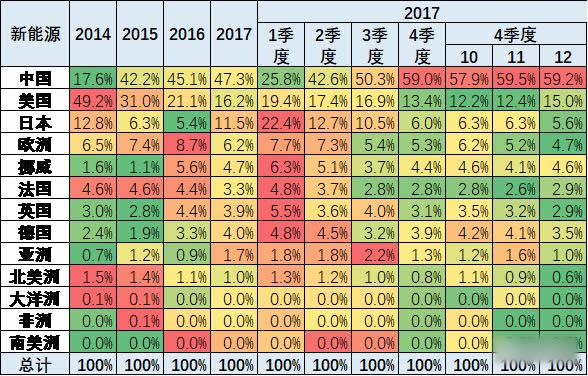 從世界新能源的企業集團表現看,北汽集團是****,比亞迪******,吉利第三,這也是中國新能源的超強世界地位。日產、寶馬、通用的表現也是很好。 6、中國純電動車的世界占比4季度達到70% 中國純電動新能源車的世界表現超強,17年12月達到73%。且近幾年逐步提升,從14年的18%上升到17年的60%,乃至12月的73%。